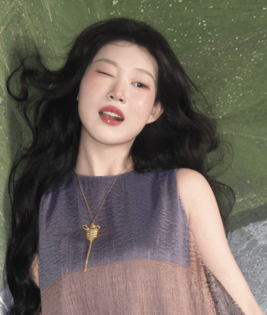 果冻甜妹妆的精髓在于“透”与“甜”的平衡,这一点在沈佳润脸上得到完美呈现。底妆采用薄透水状粉底轻拍而成,保留了肌肤自然纹理的同时,营造出如同果冻般的莹润光泽,仿佛从肌肤底层透出来的好气色。珊瑚色腮红轻点在苹果肌,顺势晕染至鼻梁,自然得如同运动后的泛红;眼妆以浅棕色调打底,下眼睑用银色细闪提亮,搭配纤长不结块的睫毛,让单眼皮的灵动藏在眼波流转间。最点睛的是唇妆,嫩粉色唇膏叠加透明唇蜜,塑造出饱满的嘟嘟果冻唇,笑起来时甜意几乎要溢出镜头。