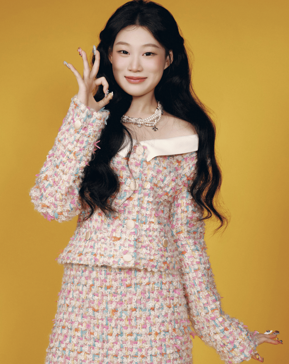 这套妆容与她的多套造型形成奇妙共鸣,每一种搭配都解锁出独特的甜妹气质。冬日冰雪造型中,她头戴白色针织帽,蓬松帽檐衬得脸庞愈发小巧,果冻妆的清透与白色针织的柔软相得益彰,仿佛踏雪而来的童话公主,怼脸镜头下的神态自然又讨喜。换上粉嫩小香风套装时,妆容的甜感与服装的精致感无缝衔接,她歪头比出“OK”手势的瞬间,腮红与笑容呼应,将少女的娇俏诠释得淋漓尽致。