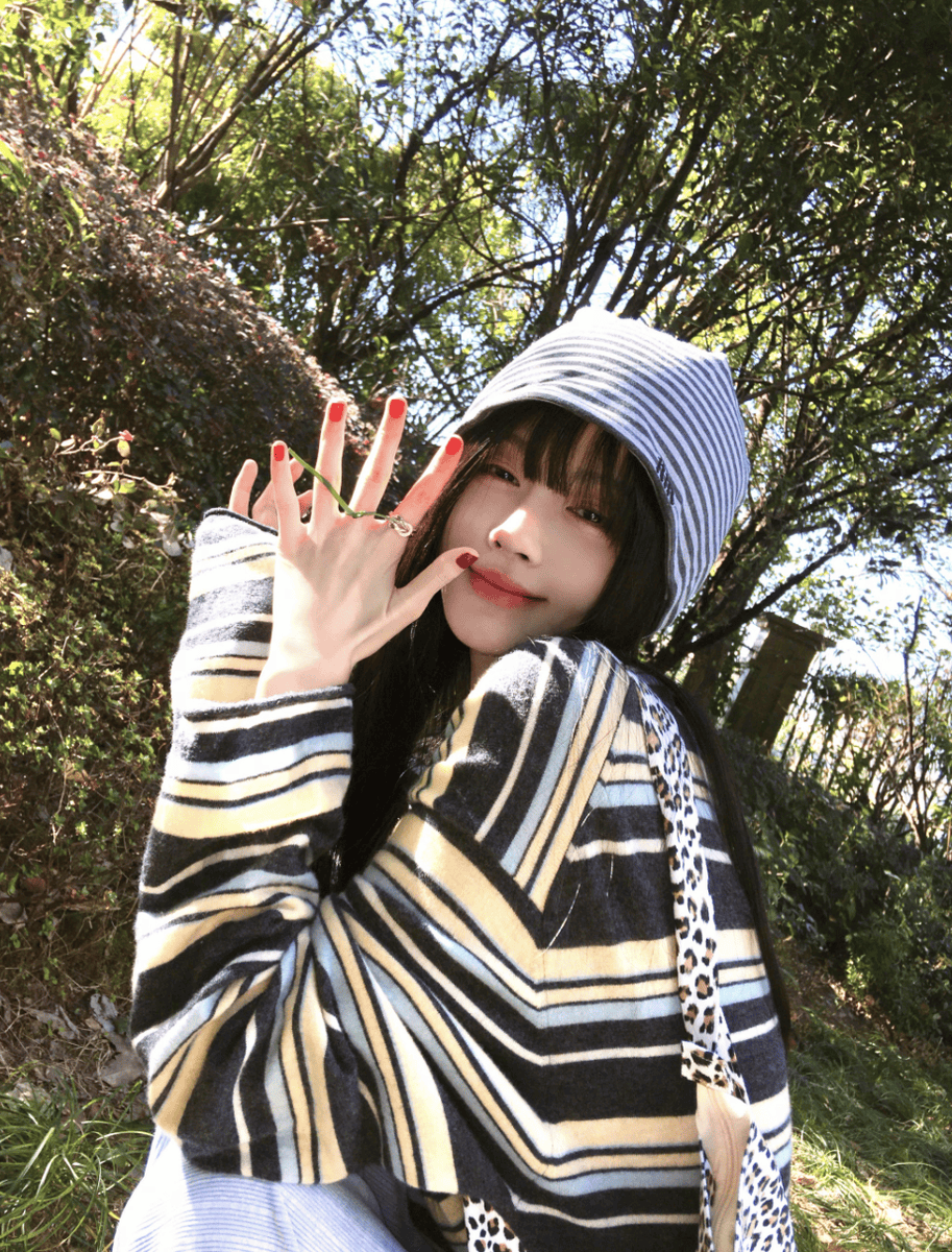照片中的穿搭堪称秋日日常模板。软塌塌的黑白条纹帽衫自带慵懒属性,帽檐随意耷拉着遮住些许眉眼,反而衬得露出的侧脸线条愈发柔和,像极了高中时偷穿学长外套的邻家女孩,满是暖烘烘的自在感。最吸睛的莫过于指尖的正红色美甲,没有刻意对准镜头展示,只是自然搭在粗糙的树干上,红与棕的碰撞瞬间点亮整个画面,为简约穿搭注入鲜活元气。这种“不费力的精致”,正是她穿搭哲学的精髓——无需夸张元素堆砌,细节就能撑起时尚感。