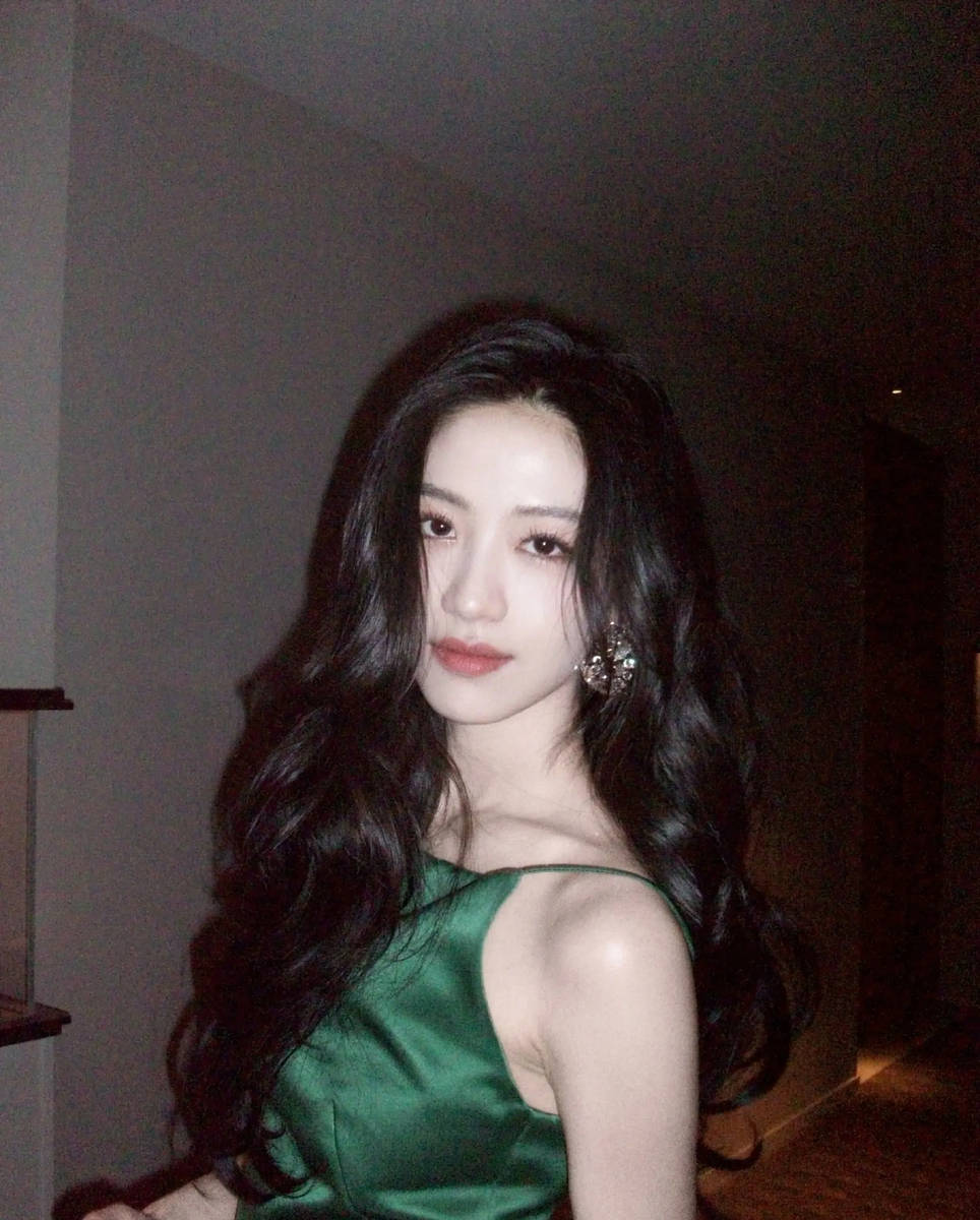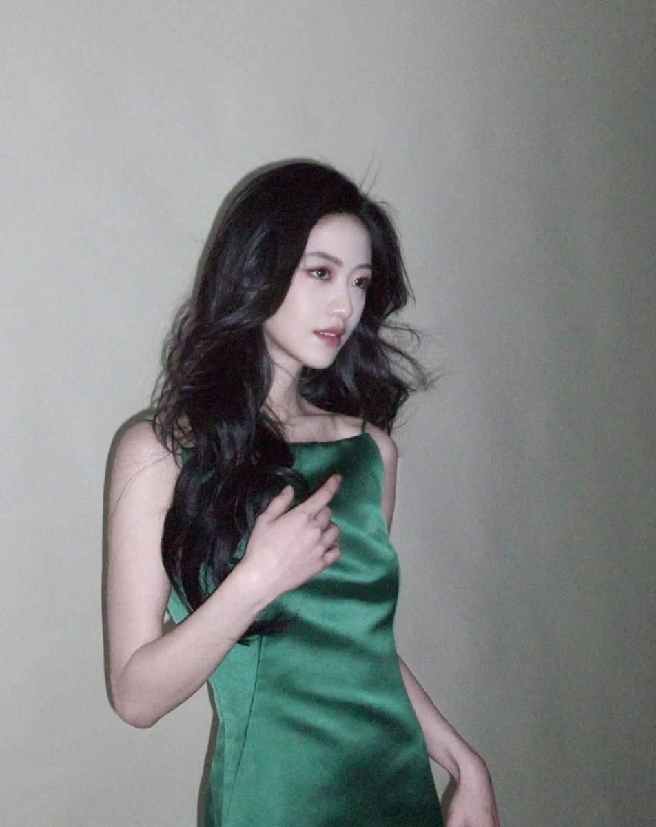 造型的精髓,始于一袭极具复古韵味的墨绿缎面裙。不同于常见的基础色系,墨绿自带高级滤镜,沉稳中藏着张力,低调却不黯淡,恰好契合当下大众追捧的“不费力的时尚感”。缎面材质自带细腻光泽,在光影流转间折射出温润又清冷的质感,贴合身形的剪裁利落不拖沓,既完美勾勒出她高挑纤瘦的身形比例,又以简约版型避开冗余设计,凸显出肩颈线条的优越与腰身的纤细,将骨感美与柔美气质平衡得恰到好处。没有夸张的装饰,仅靠面料的质感与颜色的底蕴,便自带民国画报名媛的雅致格调,尽显高级感。