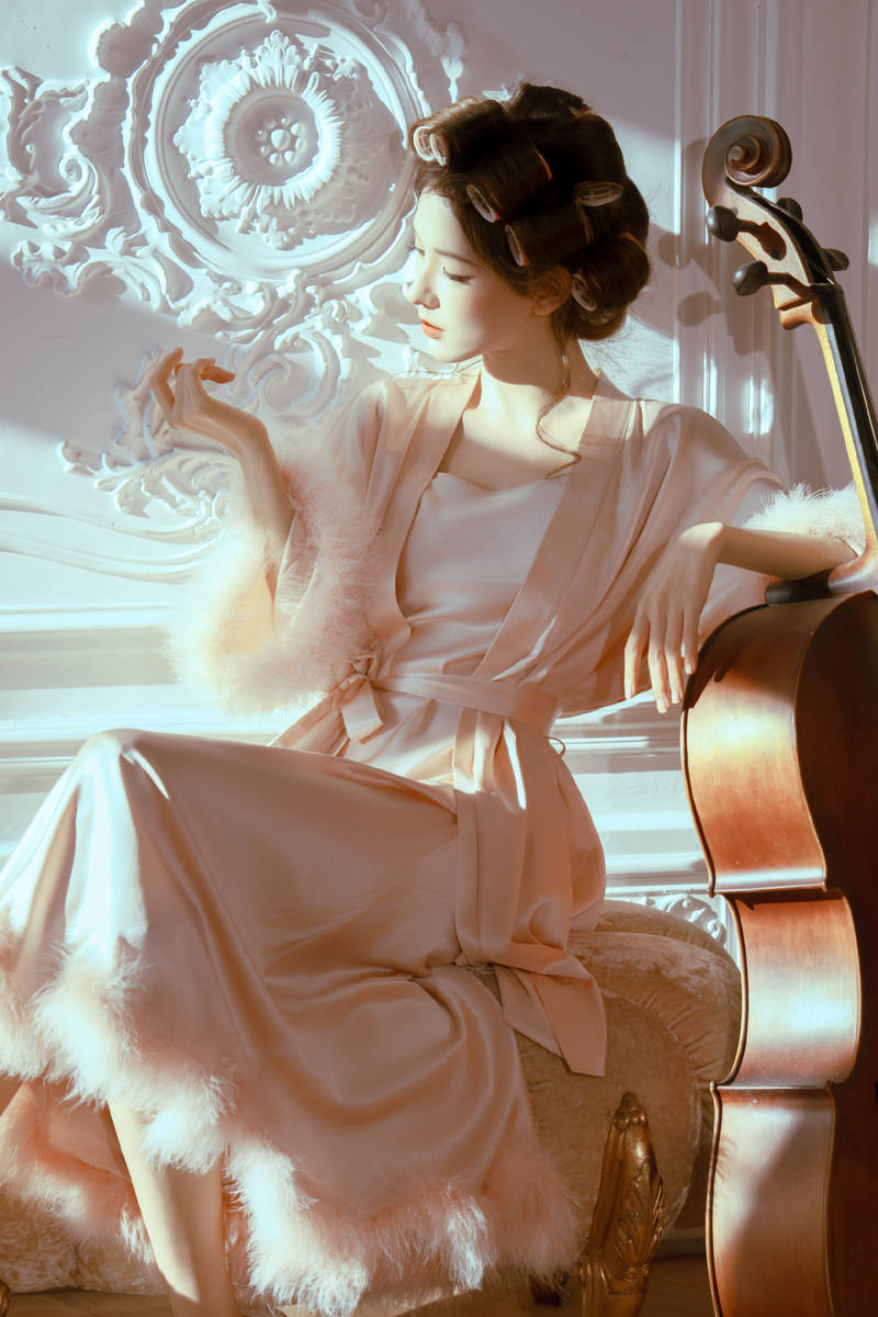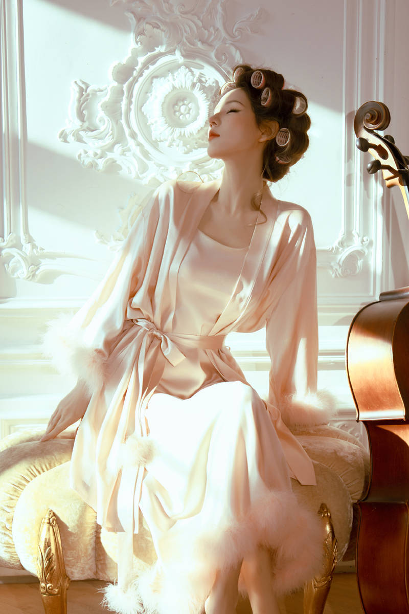 写真中,整体造型摒弃了繁琐的装饰,主打一个自然松弛,却在细节处藏满小心思。张予曦身着一袭浅粉色缎面睡袍,柔软的缎面材质在光影的映衬下,泛着细腻柔和的光泽,自带高级质感,既衬得她肌肤胜雪、通透细腻,又完美勾勒出轻盈窈窕的身姿,宽松的版型不刻意束缚,多了几分随性慵懒的韵味,仿佛刚结束一场舒适的休憩,自带松弛buff。