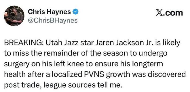 北京时间2月13日,犹他爵士队官方正式发布公告,全明星球员贾伦-杰克逊将因左膝伤势接受手术治疗,此次手术将彻底终结他本赛季的征程,这位刚刚加盟球队不久的内线核心,在仅代表爵士出战3场比赛后便无奈提前赛季报销,消息一出便引发NBA联盟广泛关注,也让爵士队的重建规划遭遇突发重创。