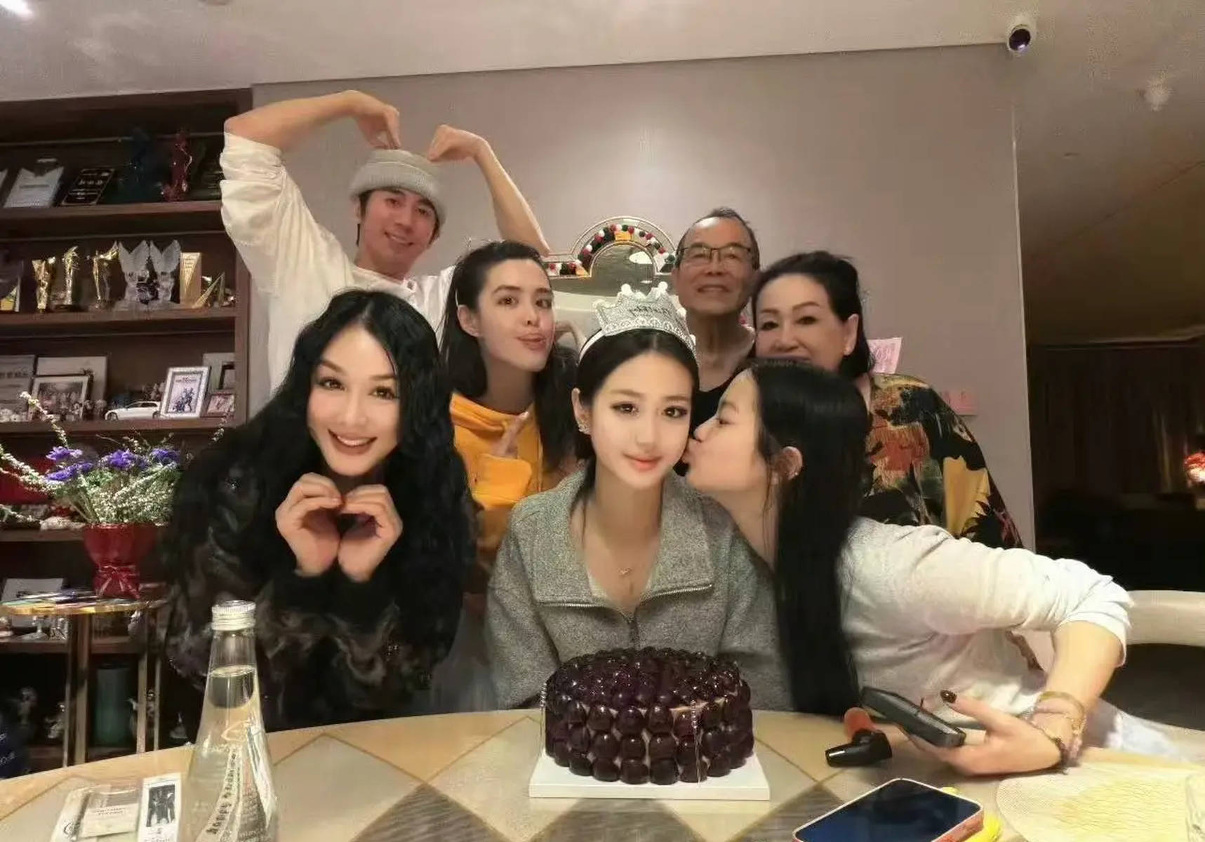 当天的主角Cayla身着灰色外套,头戴精致小皇冠,脖颈间的项链闪闪发亮,端坐于画面中央,眉眼间与钟丽缇十分相似,温柔的眼神里藏着少女的羞涩与灵动。被姐姐们围绕的她,时而被逗得开怀大笑,时而露出腼腆神情,模样乖巧又可爱。大女儿身着黄色卫衣,俏皮地吐着舌头做鬼脸,二女儿则穿着浅灰色上衣,亲昵地亲吻妹妹的脸颊,三姐妹同框的画面,既有血脉相连的默契,又有少女间的鲜活灵动,十分动人。
