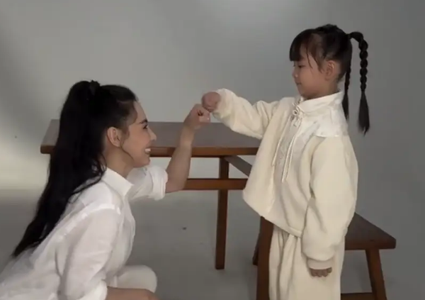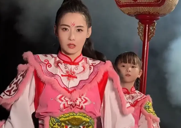 视频开篇,张柏芝还是日常温柔模样,与身边的小女孩轻声互动、俏皮碰拳,画面暖意十足。随着激昂的锣鼓声响起,镜头一转,变装瞬间完成——她身着绣工精致的英歌舞服饰,搭配利落高马尾,眉眼间褪去柔和,添了几分凌厉锋芒,面部轮廓被衬得愈发立体,完美契合英歌舞的豪迈气质。身旁的小女孩也换上同款简约服饰,跟着节奏抬手、挥槌,模样可爱又认真,与张柏芝的飒爽形成巧妙呼应。