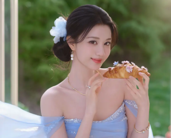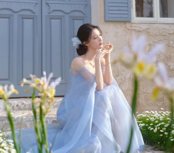 妆容与造型完美呼应,淡雅的裸妆凸显原生骨相之美,眉形纤细柔和,眼尾微微上扬,眼波流转间,既有江南水乡的灵秀,又有世家女子的贵气,清灵的眉眼自带故事感,不笑时清冷疏离,浅笑时暖意漫溢,娇而不媚,甜而不腻。低盘发造型简约大气,发丝轻垂脸颊,偶尔有几缕碎发被微风拂动,更添几分慵懒随性,发间点缀的浅蓝小花,与纱裙色调呼应,让整体造型更显精致灵动。