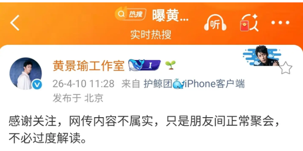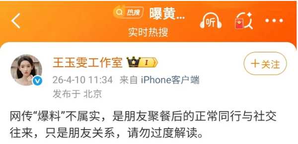 绯闻发酵仅半小时,双方工作室便同步下场辟谣,速度被网友调侃为“内娱辟谣天花板”。11点28分,黄景瑜工作室率先发布声明,称网传内容不属实,只是朋友间的正常聚会,呼吁大家不必过度解读。六分钟后,王玉雯工作室紧随其后,措辞与黄景瑜方高度一致,明确表示网传爆料不实,两人仅是朋友关系,此次同行只是朋友聚餐后的正常社交往来。